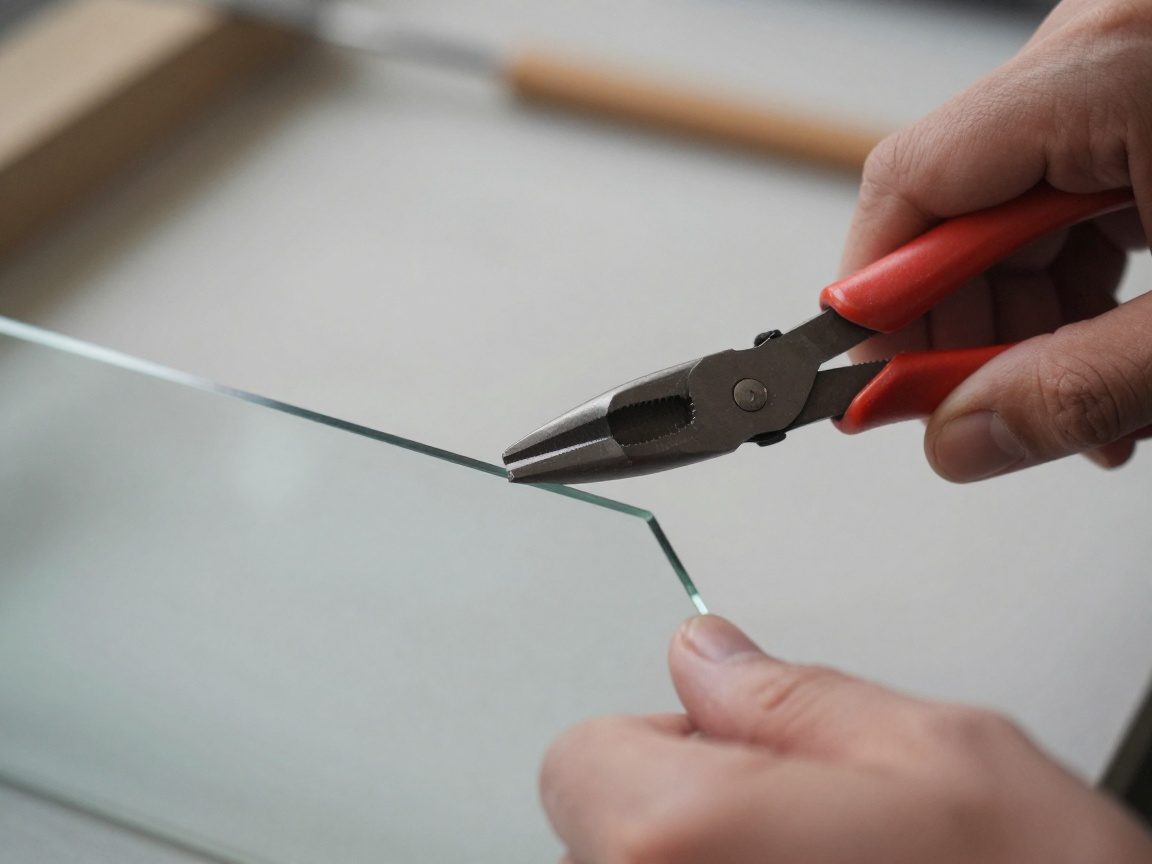 - Nach dem Anreißen wird das Glas entlang der Ritzlinie an einer ebenen Tischkante oder einem Brechbogen gebrochen; ein sanfter, gleichmäßiger Druck von 3–4 N pro Zentimeter reicht, um einen sauberen Bruch zu erzielen.